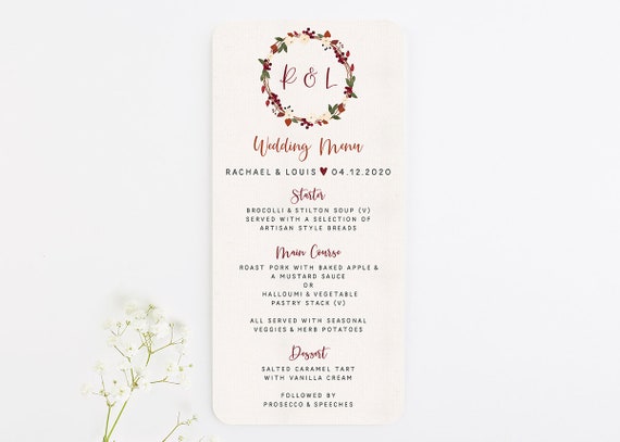 Printable Wedding Menu Card Wreath Seasonal Winter Vintage Traditional Calligraphy Customisable Christmas Seasonal Weddbook