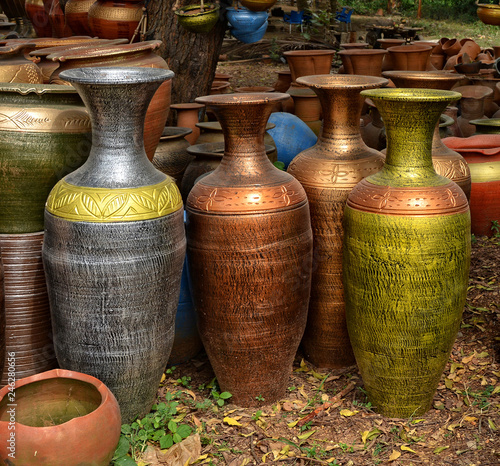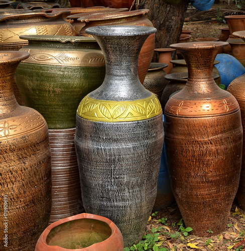 Unique Handmade Colorful Ceramic Vases Clay Pots Stacked For Sale In A Yard Pottery Making Place Local Craft Market Craftsmanship Brown Gray Colors Buy This Stock Photo And Explore Similar Images
