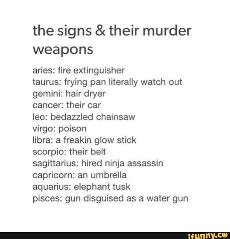 The Signs Their Murder Weapons Aries fire Extinguisher Taurus Frying Pan Literally Watch Out Gemini Hair Dryer Cancer Their Car Leo Bedazzled Chainsaw Virgo Poison Libra A Freakin Glow Stick Scorpio
