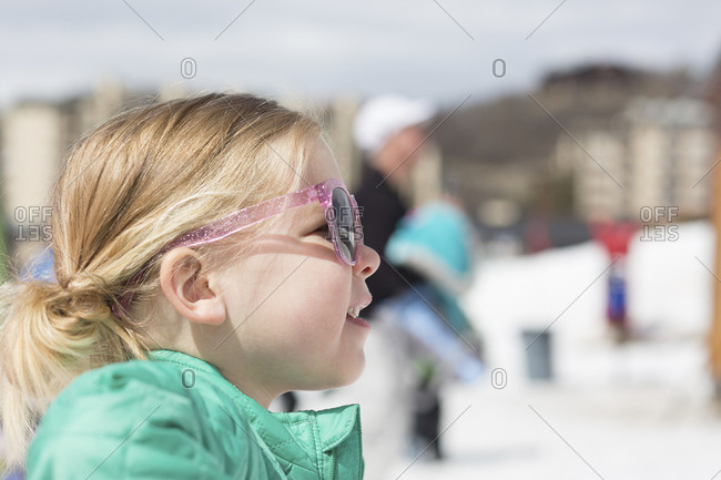 Side View Of Girl Wearing Sunglasses While Standing Against Sky During Winter Stock Photo Offset