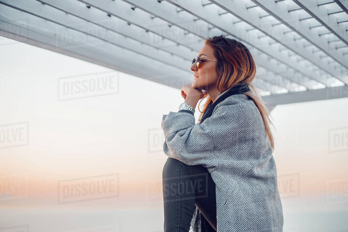 Side View Of Woman Wearing Sunglasses While Standing By Retaining Wall Against Clear Sky Stock Photo Dissolve