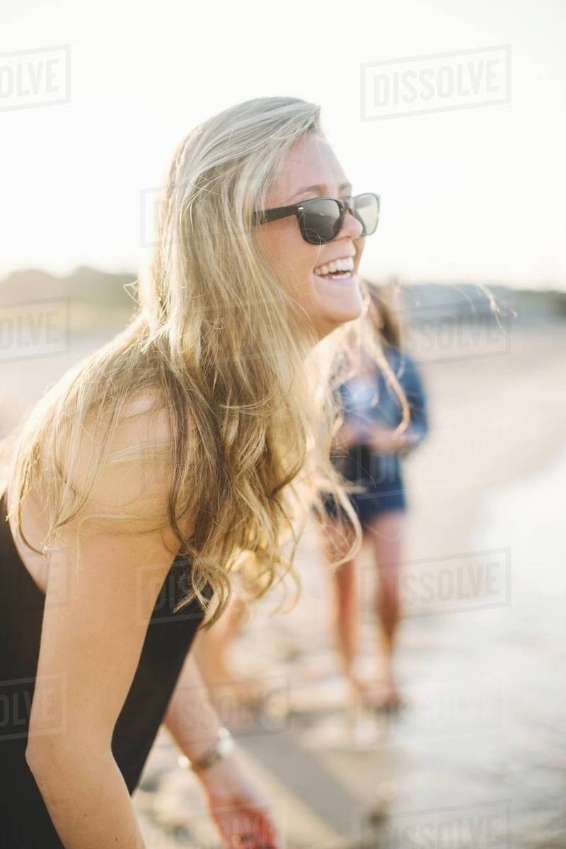 Side View Of Blonde Woman On Beach Wearing Sunglasses Looking Away Smiling Stock Photo Dissolve