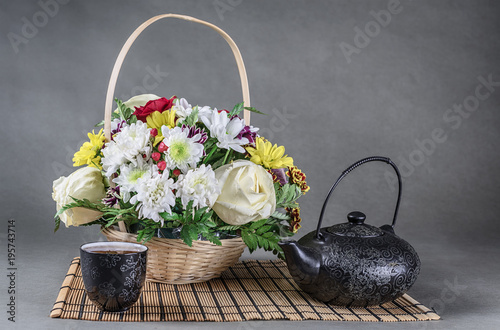 Still Life Gift Basket With Flowers Black Teapot And A Small Cup Without A Handle With Hot Tea Buy This Stock Photo And Explore Similar Images At Adobe Stock Adobe Stock