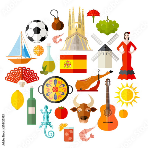 Spain Character Set With Flat Style Popular Spanish Attributes And Souvenirs Vector Illustration On The Theme Of Traveling In Europe Collection Of Themed Icons Buy This Stock Vector And Explore Similar