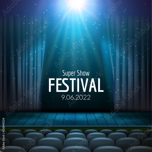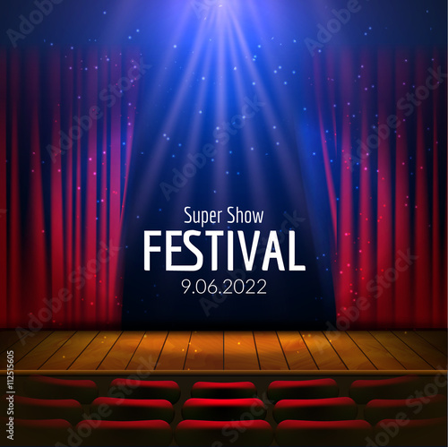 Theater Wooden Stage With Red Curtain Spotlight Seats Vector Festive Template With Lights And Scene Poster Design For Concert Theater Dance Event Show Illumination And Scenery Decoration Stock Vector C Sensvector