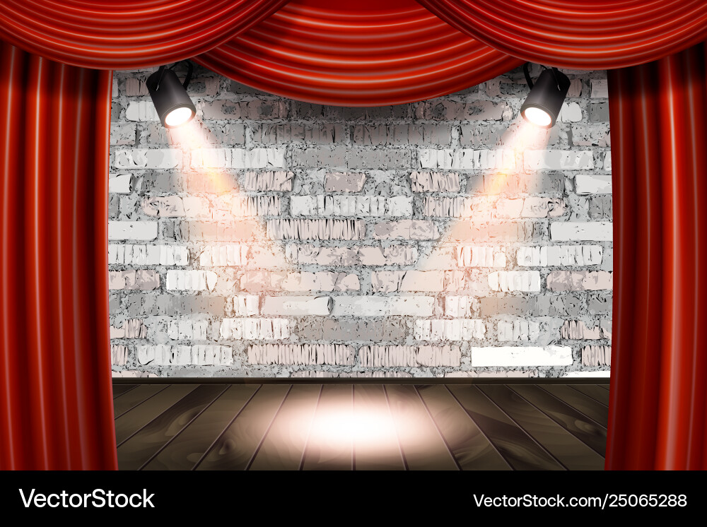 Theater Wooden Stage With Red Curtain And Spotlight Vector Festive Template With Lights And Scene Poster Design For Concert Theater Party Dance Event Show Illumination And Scenery Decoration Stock Vector C