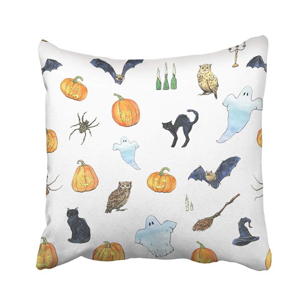 Arhome Watercolor Halloween With Ghost Bat Black Cat Owl Spider Witch Hat Broom Besom Pillow Case Pillow Cover 18x18 Inch Throw Pillow Covers Walmart Com Walmart Com
