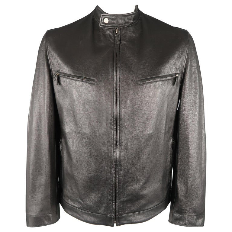 Gucci 42 Black Textured Leather Zip Up Band Collar Motorcycle Jacket At 1stdibs