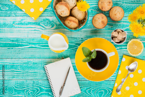 Cup Of Black Tea On Yellow Plate And Yellow Milk Jug Cane Sugar Notebook Pen Cakes Dandelions Teaspoon On Turquoise Colored Wooden Table With Yellow Napkin At Polka Dots Top View Buy