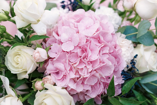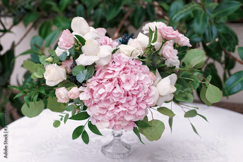 Original Wedding Floristics Closeup The Wedding Flower Bouquet Is Supplemented With Rose Hortensia Roses And Greenery Floral Background Buy This Stock Photo And Explore Similar Images At Adobe Stock Adobe Stock