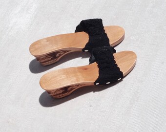Moheda Clog Sandals Size 38 Black Natural Wood Soles