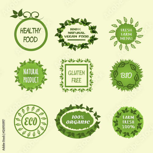 Set Vegetable Logos Healthy Food 100 Vegan Natural Product Farm Fresh Menu Gluten Free Bio Eco Organic Nine Green Labels Buy This Stock Vector And Explore Similar Vectors At Adobe Stock