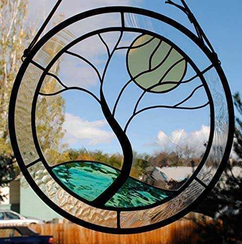 Amazon Com Stained Glass Window Panel Crystal Tree Yellow Moon Round Glass Panel Clear Handmade