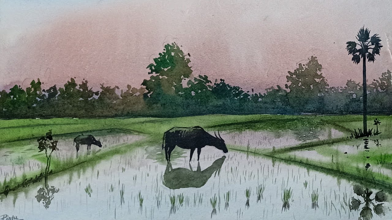 Watercolor Landscape Painting Grassing Buffalo Reflection On Water Youtube