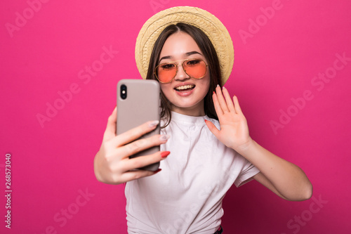Sociable Asian Young Girl Taking Selfie Or Speaking On Video Call Using Cell Phone Isolated Over Pink Background Buy This Stock Photo And Explore Similar Images At Adobe Stock Adobe Stock