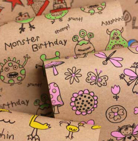 Printed Kraft Paper Gift Wrap Pack 1 Roll 3m Doodles Etsy