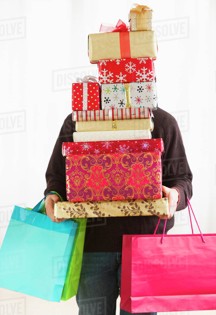 Man Carrying Stack Of Christmas Presents Studio Shot Stock Photo Dissolve