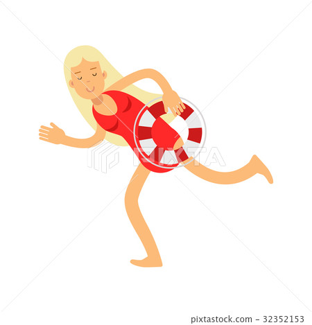 Cute Lifeguard Girl In A Red Swimsuit Running With The Lifepreserver Buoy Vector Illustration In Flat Cartoon Style Stock Illustration Download Image Now Istock
