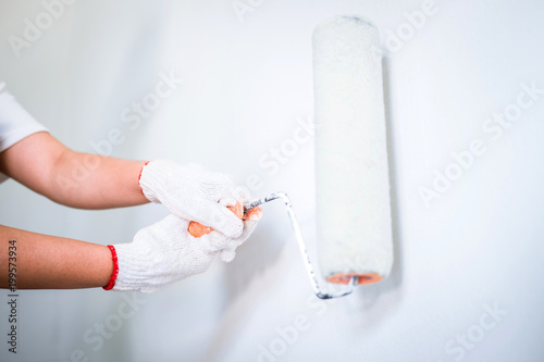 Interior Working Painter Hand In White Glove Painting Wall With Paint Roller In Room Shape And Structure Stock Photo B 3234 4ac4 949b 405fbaa03e2a