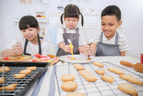 Three Asian Children Having Good Time Decorating Cookies Portrait Of Little Asian Girls Her Brother Baking Cake And Cookies In The Kitchen Happy Family Sibling Concept Buy This Stock Photo And