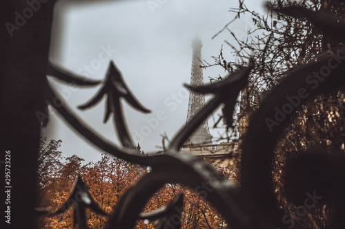 Wrought Iron Lattice Of A Metal Fence With Sharp Poles On The Background Of The Eiffel Tower On A Foggy Cloudy Day Buy This Stock Photo And Explore Similar Images At