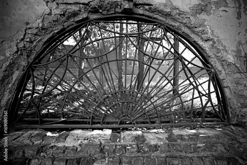 Arched Window With Wrought Iron Lattice And Decorative Figures In The Brick Wall Window Isolated With Clipping Path Stock Photo Download Image Now Istock