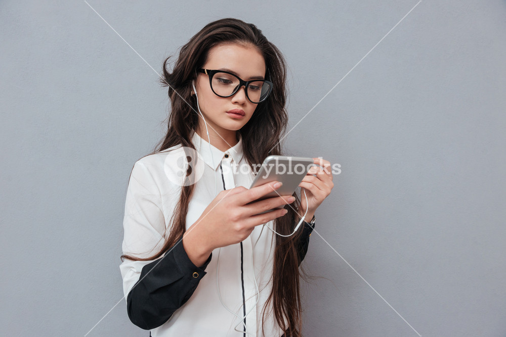 Young Cute Asian Woman In Glasses Listening To Music On Phone Isolated Gray Background Royalty Free Stock Image Storyblocks