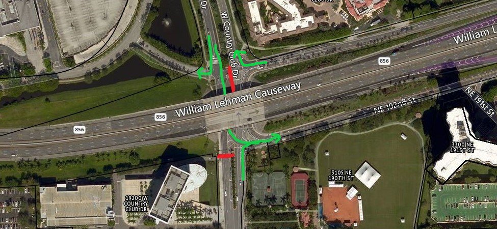They also redirected traffic on West Country Club Drive from the William Lehman Causeway to 190th Street.