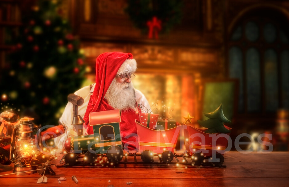 Santa S Workshop Digital Background Santa S Toy Shop Layered Psd Santas Work Shop Santa With Train Holiday Christmas Digital Background Backdrop