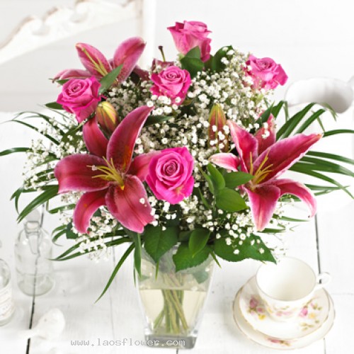 Pink Flower Vase Consists Of 6 Pink Roses 5 Pink Lilies White Gypsophila