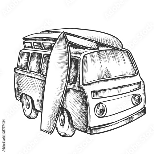 Surf Boards And Retro Surf Van Monochrome Vector Surfboards Standing Near Minivan Car Longboards Engraving Concept Template Hand Drawn In Vintage Style Black And White Illustration Buy This Stock Vector And