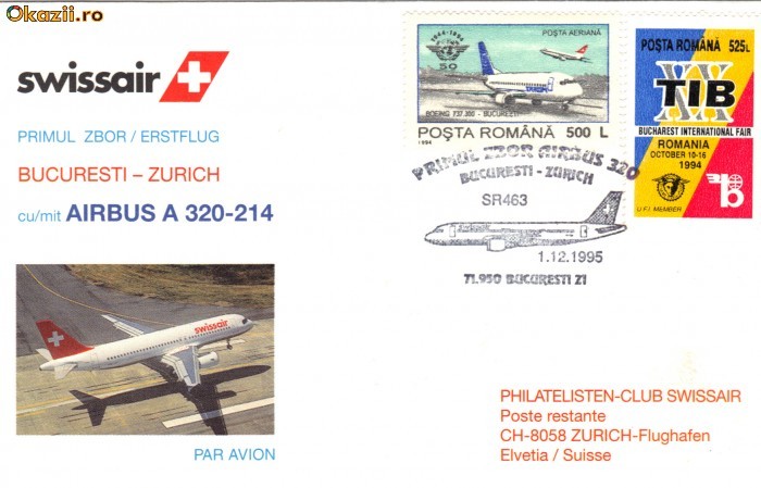 Plic Aerofilatelic Primul Zbor Airbus 3 Bucuresti Zurich Cu Swissair Okazii Ro