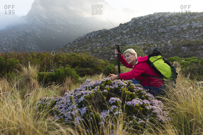 Young Woman Traveler Walking Flower Field Mountain Stock Photo C Kitzcorner