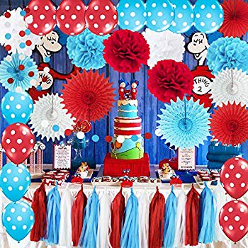 Dr Seuss Cat In The Hat Party Dr Seuss Decoration Turquoise White Red Tissue Paper Fans For Baby Shower Decorations Circus Carnival Party Decorations Airplane Birthday Party Decorations Qian S Party Tissue Pom Poms