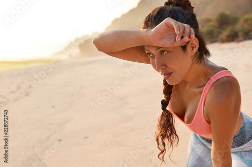 Tired Fitness Woman Wipes Sweat From Forehead Feels Fatigue After Active Cardio Workout Does Fitness Exercise Poses On Sandy Beach With Free Space Aside Has Serious Expression Into Distance Buy This