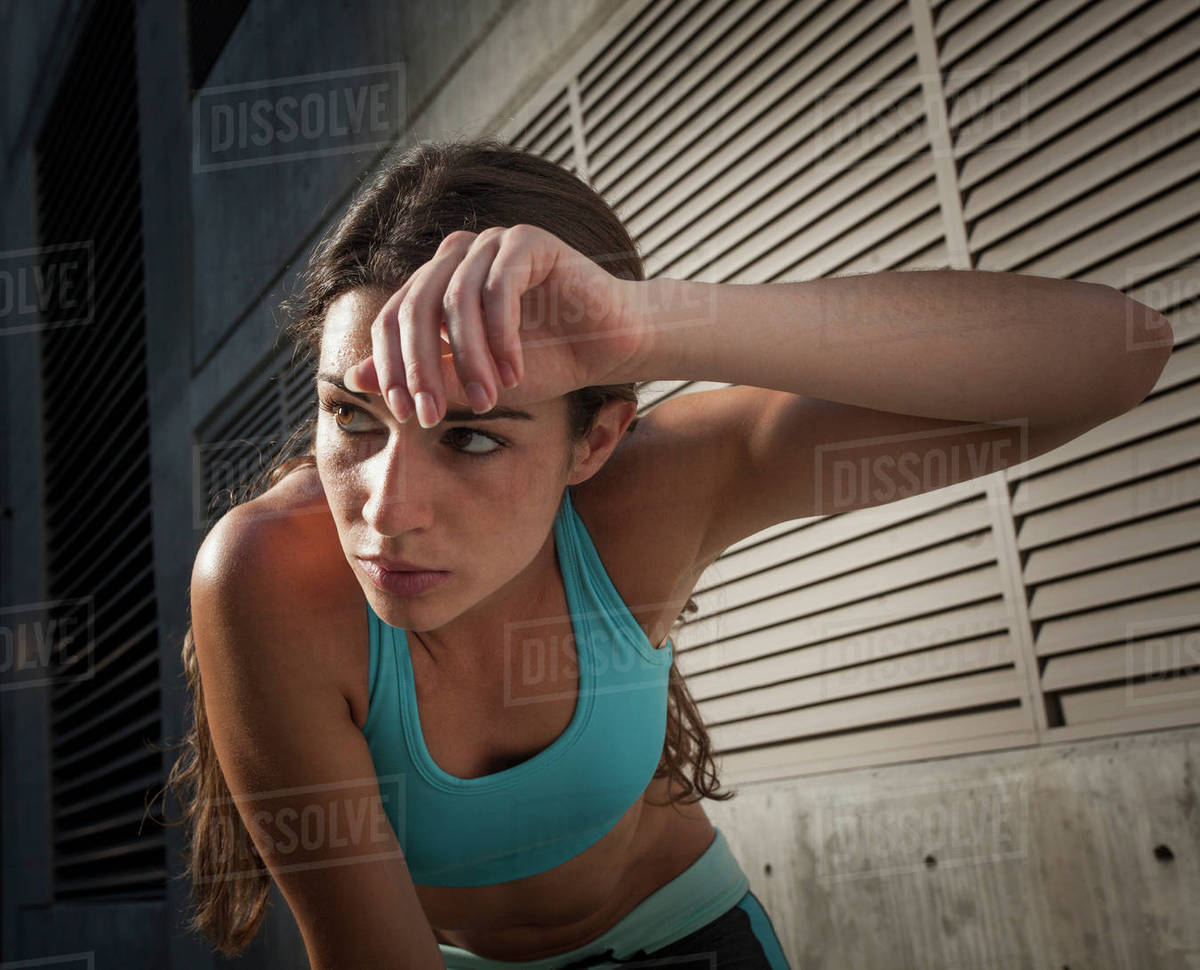 Woman Wiping Sweat Off Forehead After Workout High Res Stock Photo Getty Images