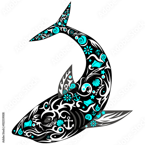 Shark With Drawing A Sea Animal An Illustration Of Fish The Predator With Design The Children S Picture Large Fish A Vector Shark A Pattern From Cockleshells And Flowers Buy This Stock