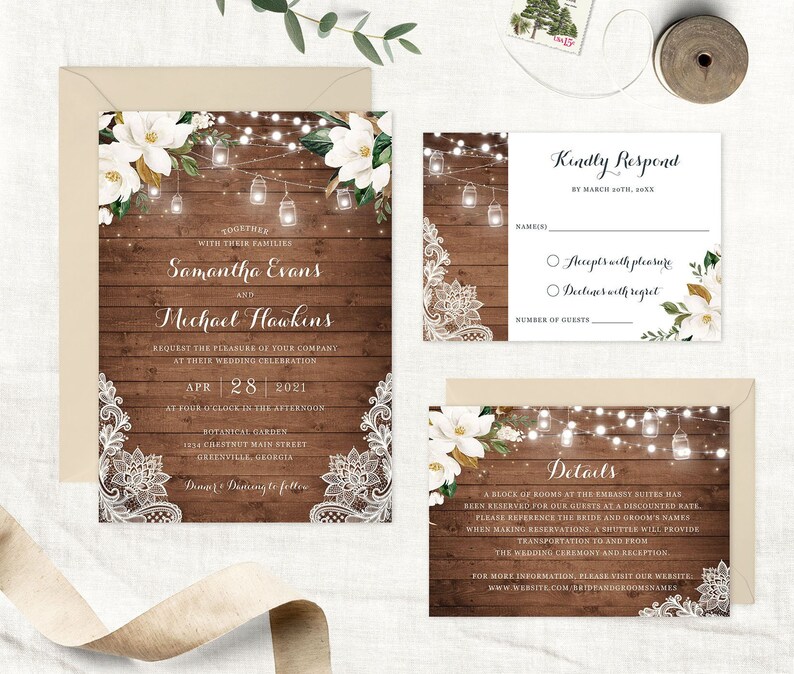 Rustic Magnolia Wood Wedding Invitation Template Editable Etsy