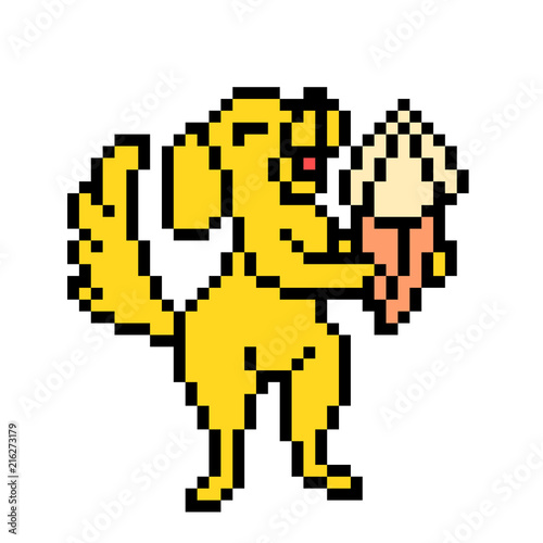 Happy Yellow Dog Enjoying Ice Cream Cone In The Summer Heat Cartoon Pixel Art Character Isolated On White Background Retro 80s 90s Slot Machine Video Game Graphics Funny Street Food Logo Buy