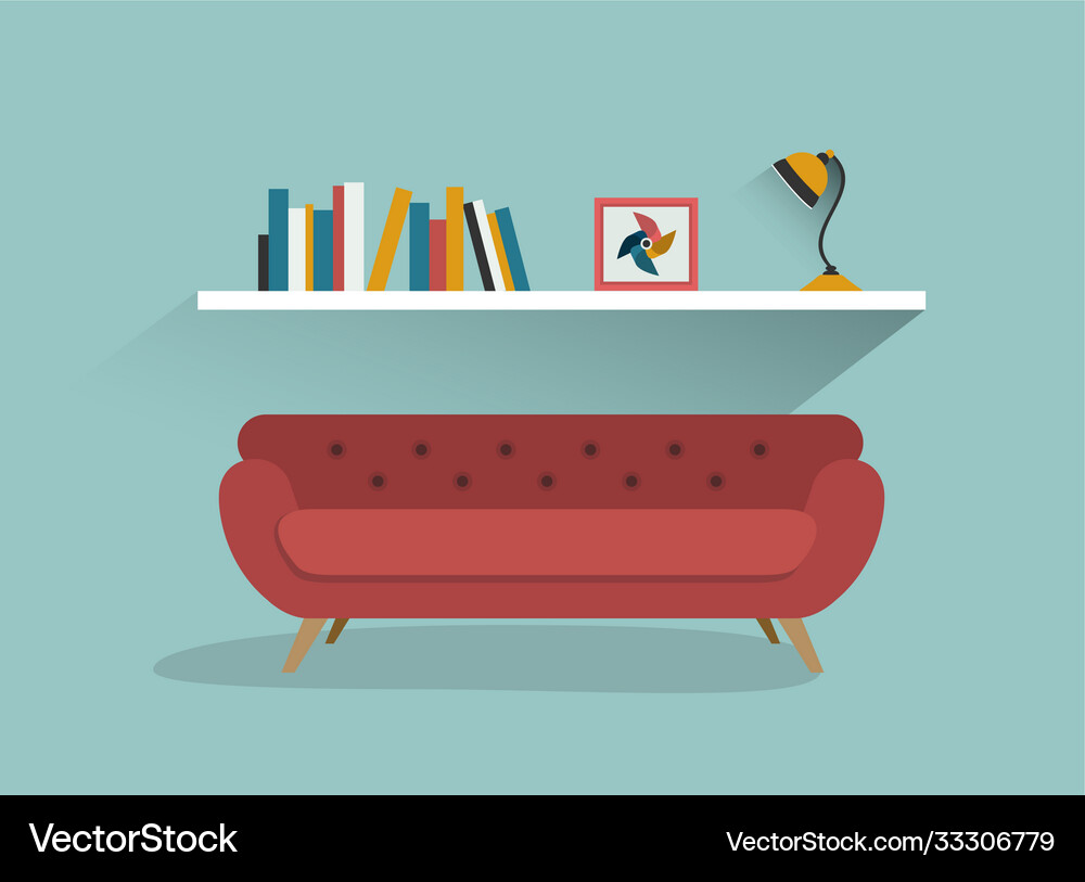 Retro Red Sofa And Book Shelf With Lamp Flat Vector Image
