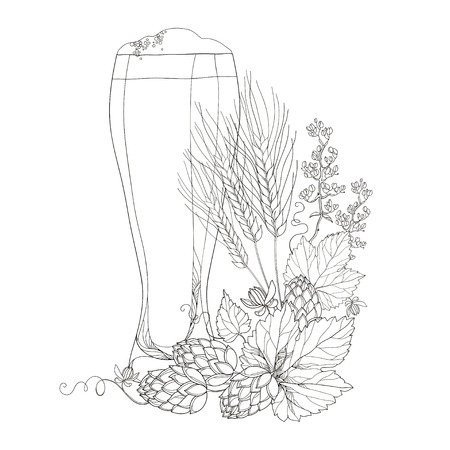 Vector Beer Glass With Ornate Wreath Of Hops And Barley Isolated On White Outline Hops Barley For Oktoberfest Brewery And Beer Design Beer Elements In Contour Style For Coloring Book Royalty Free Vector