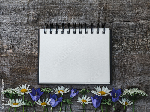 Beautiful Bouquet Of Bright Flowers Blank Notepad Page And Unpainted Boards Place For Your Inscription Top View Close Up Congratulations To Loved Ones Family Relatives Friends And Colleagues Buy This Stock Photo