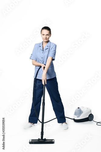 Woman Working With Vacuum Cleaner On White Stock Photo Picture And Royalty Free Image Pic Wr Agefotostock