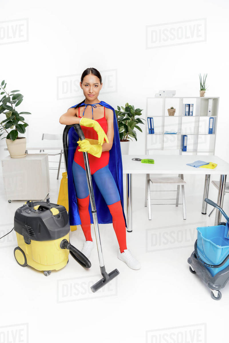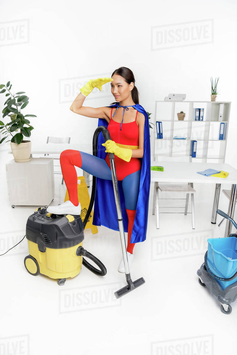 Beautiful Young Asian Woman In Superhero Costume Posing With Vacuum Cleaner Stock Photo Dissolve