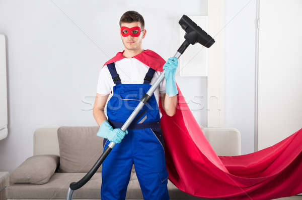 Man In A Superhero Costume Vacuuming A Carpet Stock Photo C Ljsphotography