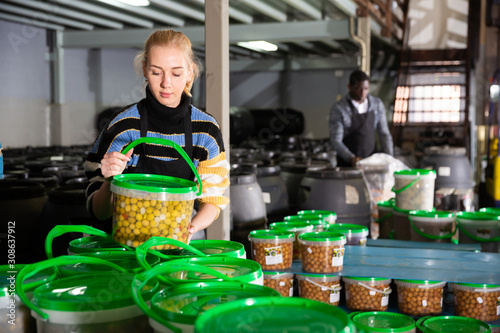 Female Worker Stocks Plastic Containers And Cans With Olives In Warehouse Buy This Stock Photo And Explore Similar Images At Adobe Stock Adobe Stock