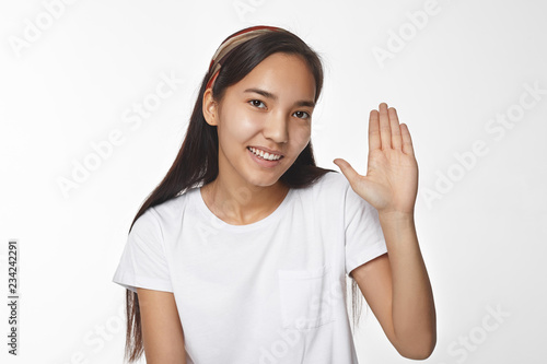 Positive Friendly Looking Young Korean Female In White Casual Top Showing Welcoming Greeting Gesture Charming Chinese Girl Waving Hand Saying Hello Hi Or Goodbye And Smiling Broadly At Camera Buy This