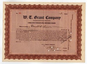 W T Grant Company Department Store Preferred Stock Certificate Signed By Founder William Thomas Grant Massachusetts