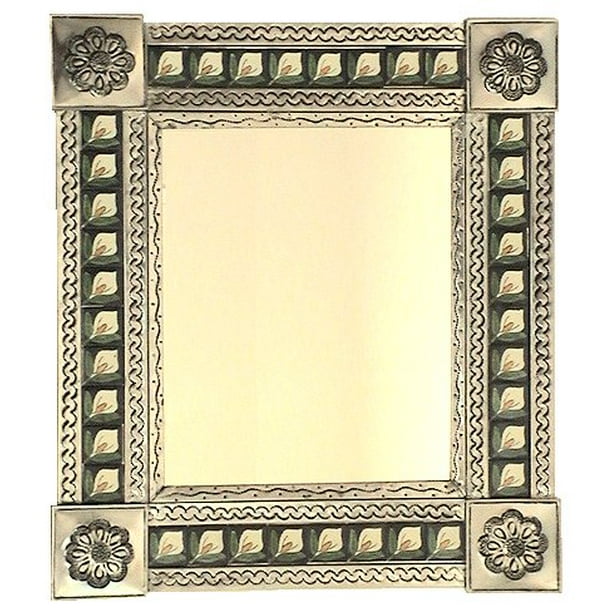 Mexican Tin Frame Mirror Talavera Tiled With A Antiqued Silver Color Finish And Hand Painted Talavera Tile Will Look Great In Any Room In Your House Each Of The Corners Has A
