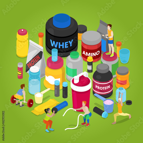 Isometric Sports Nutririon Elements With Supplements Protein Bottle Pills Vitamins Whey Vector Flat 3d Illustration Clipart K Fotosearch